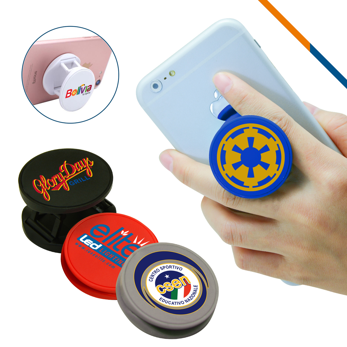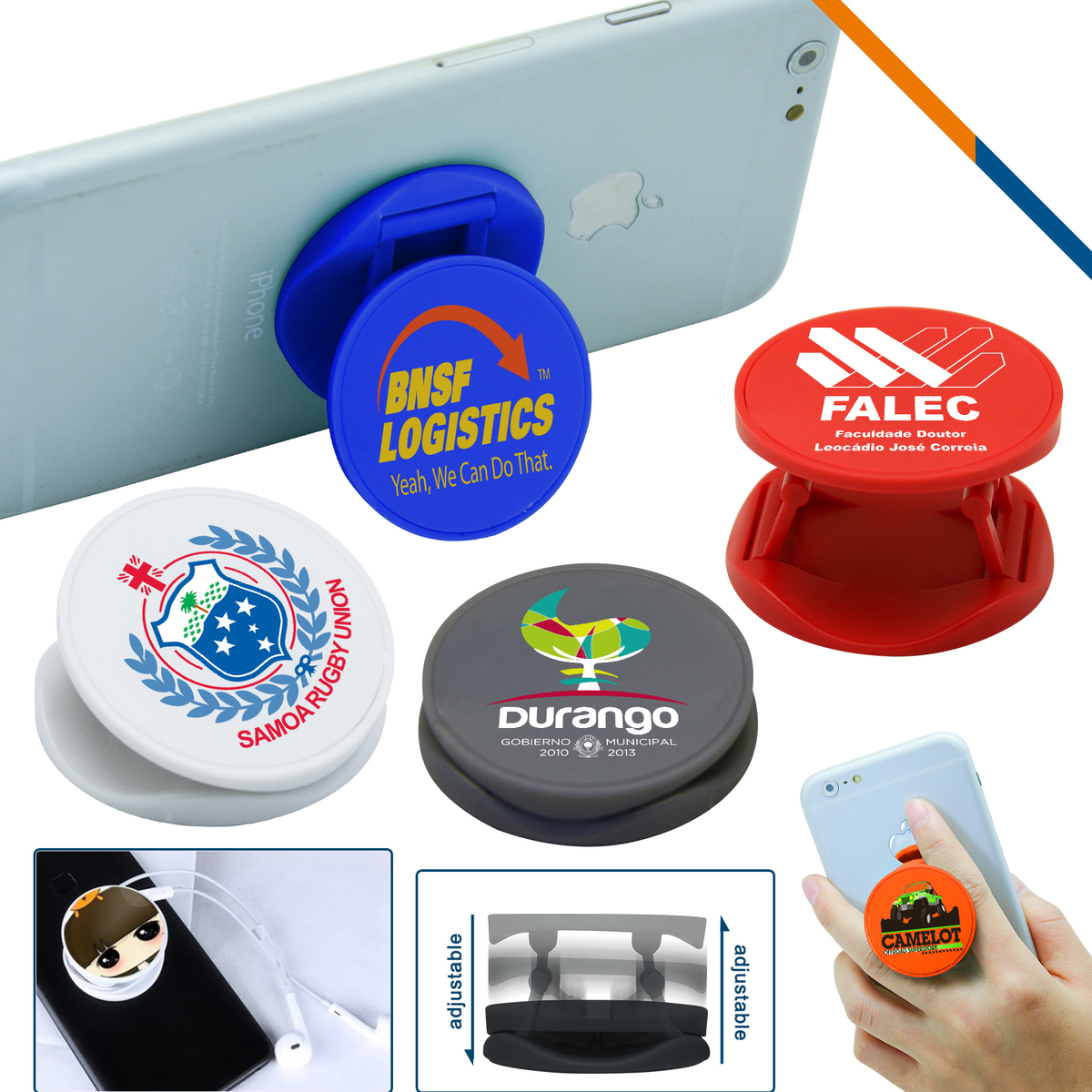 Make your phone "stand at attention" with this amazing 2 in 1 stand and phone holder! Measuring 1.74" x 1.74" x 0.41", this stand and holder is crafted from plastic and features an adhesive back that sticks firmly to all smartphones and tablets. This super-convenient cell phone holder can be used either horizontally or vertically as a phone stand and when extended, it doubles as an earbud organizer. It's perfect for use at home or in the office. Here's the best part: we offer customization! You can add your brand name, logo, a personalized message, or anything else you can think of. Don't wait another minute! Purchase this nifty 2 in 1 stand and phone holder today and unlock the full potential of your mobile phone!