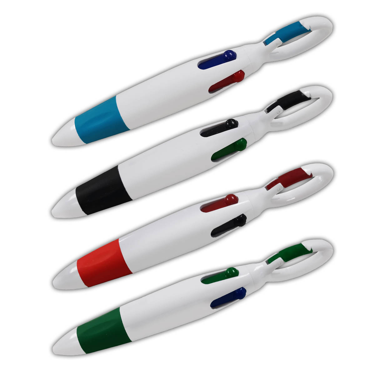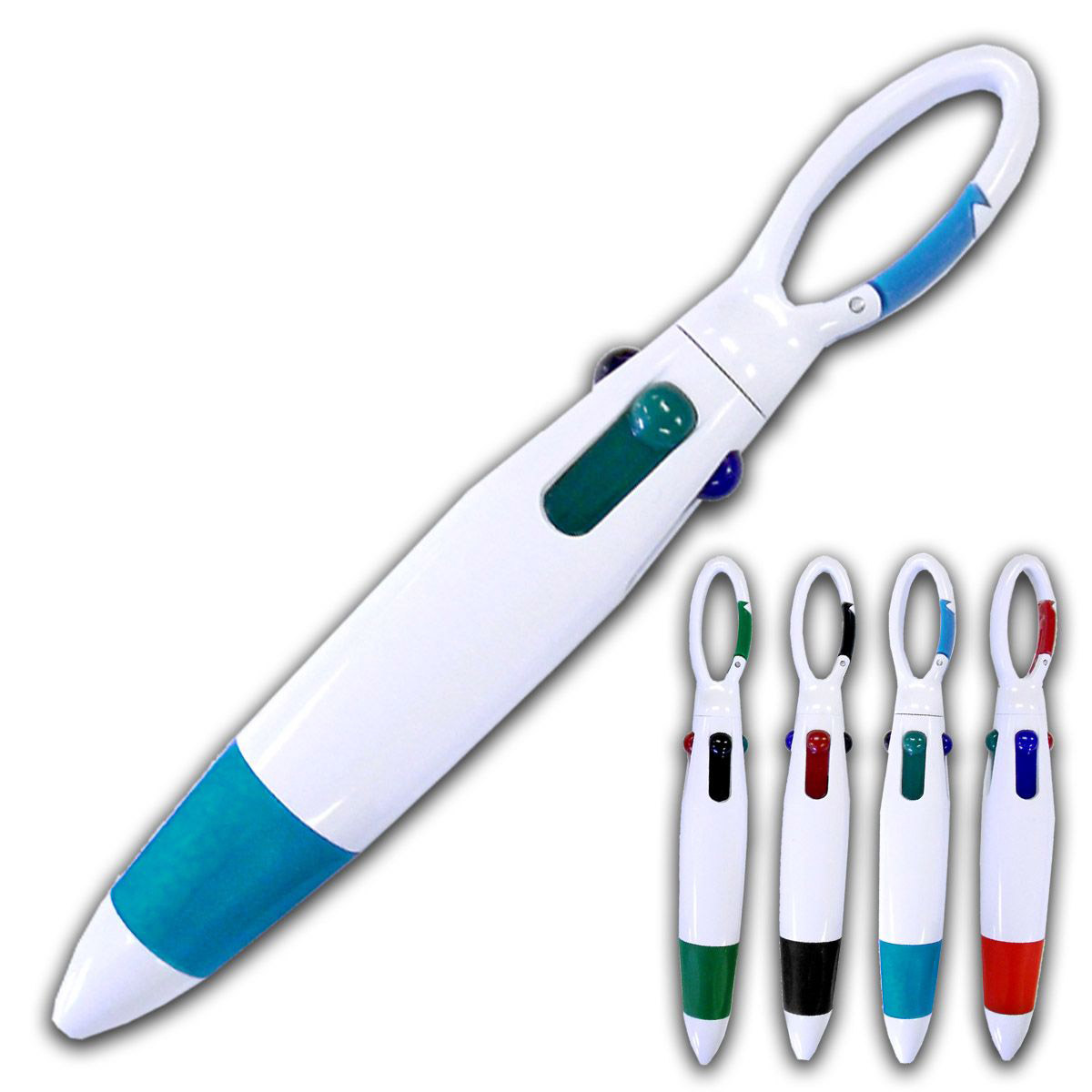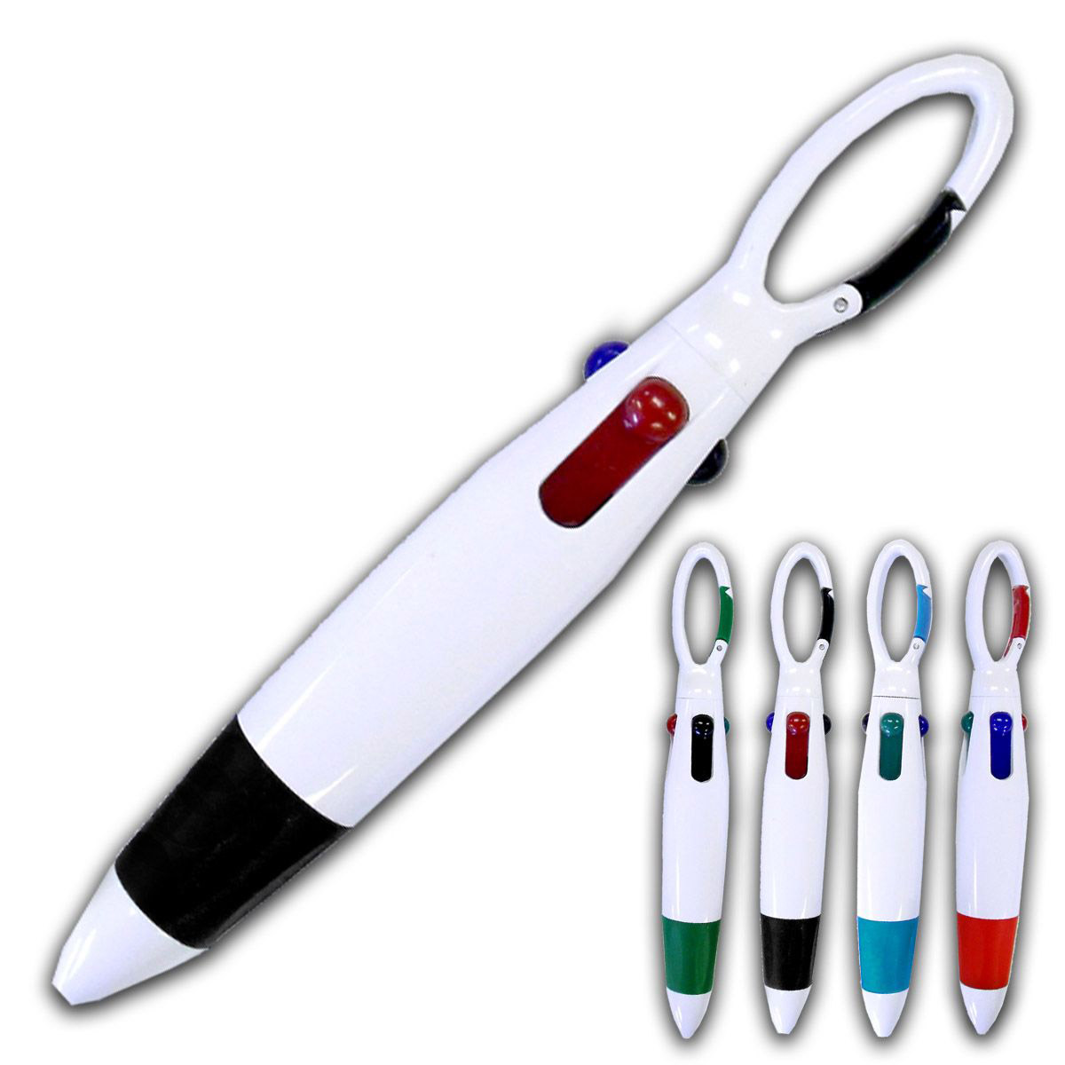 Delight them with this unique 4-Color Carabiners ballpoint pen. Each pen writes in 4 different colors: black, blue, red and green. Elegant and stylish premium quality ballpoint pen with comfort grip, in fashionable and popular colors as shown. Perfect for trade shows, sales visits and everyday office use. Length 5.5" approximately.