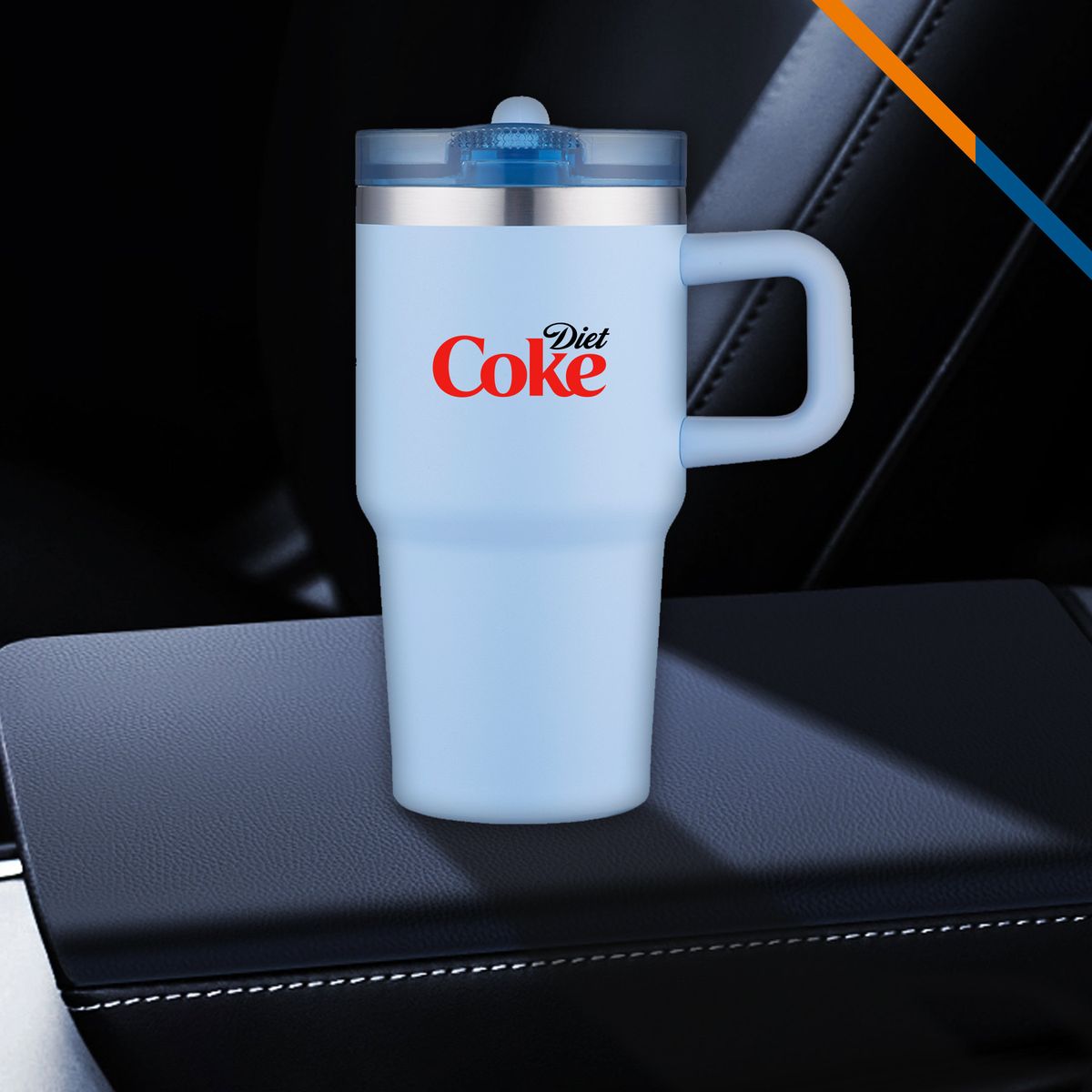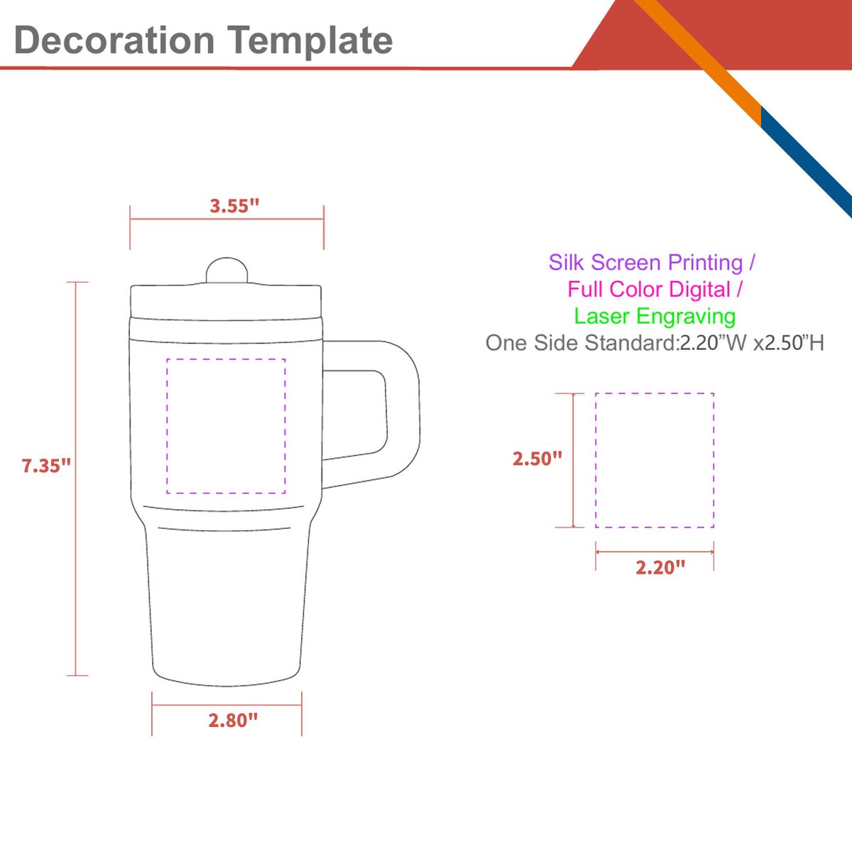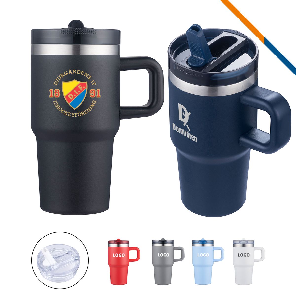 Surge Vacuum Travel Mug have the perfect imprint area for your logo. This 20 oz mug features PFAS free powder coated with a stainless steel outer & inner wall. Double wall vacuum insulation keeps beverages cold up to 12 hours and hot up to 8 hours, keeps your drinks fresh longer. The built-in straw lid delivers reliable leak-proof and spill-proof performance, and it comes with an ergonomic handle for convenient sipping at home, on the road or at the office. Fits in most car cup holders. Perfect for office, travel, camping, and party. Imprint drinkware only can be hand wash.